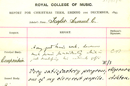 Samuel Coleridge-Taylor studied under Charles Villiers Stanford at the Royal College of Music from 1890 to 1897. He soon became a musical celebrity thanks to his trilogy of cantatas known as The Song of Hiawatha, which became one of the most performed choral pieces in Britain at the time. Coleridge-Taylor gained unusual and important status as a prominent black musician in late-Victorian and Edwardian Britain.